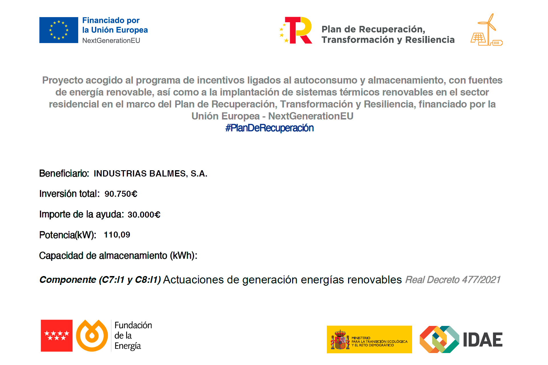 En Industrias Balmes avanzamos en nuestro camino hacia una transición energética gracias a los fondos Next Generation EU. Estos fondos se encuadran dentro del Plan de Recuperación, Transformación y Resiliencia de España. La ayuda concedida, de 30.000€, se destina a una instalación fotovoltaica que promueva el autoconsumo de energías renovables.